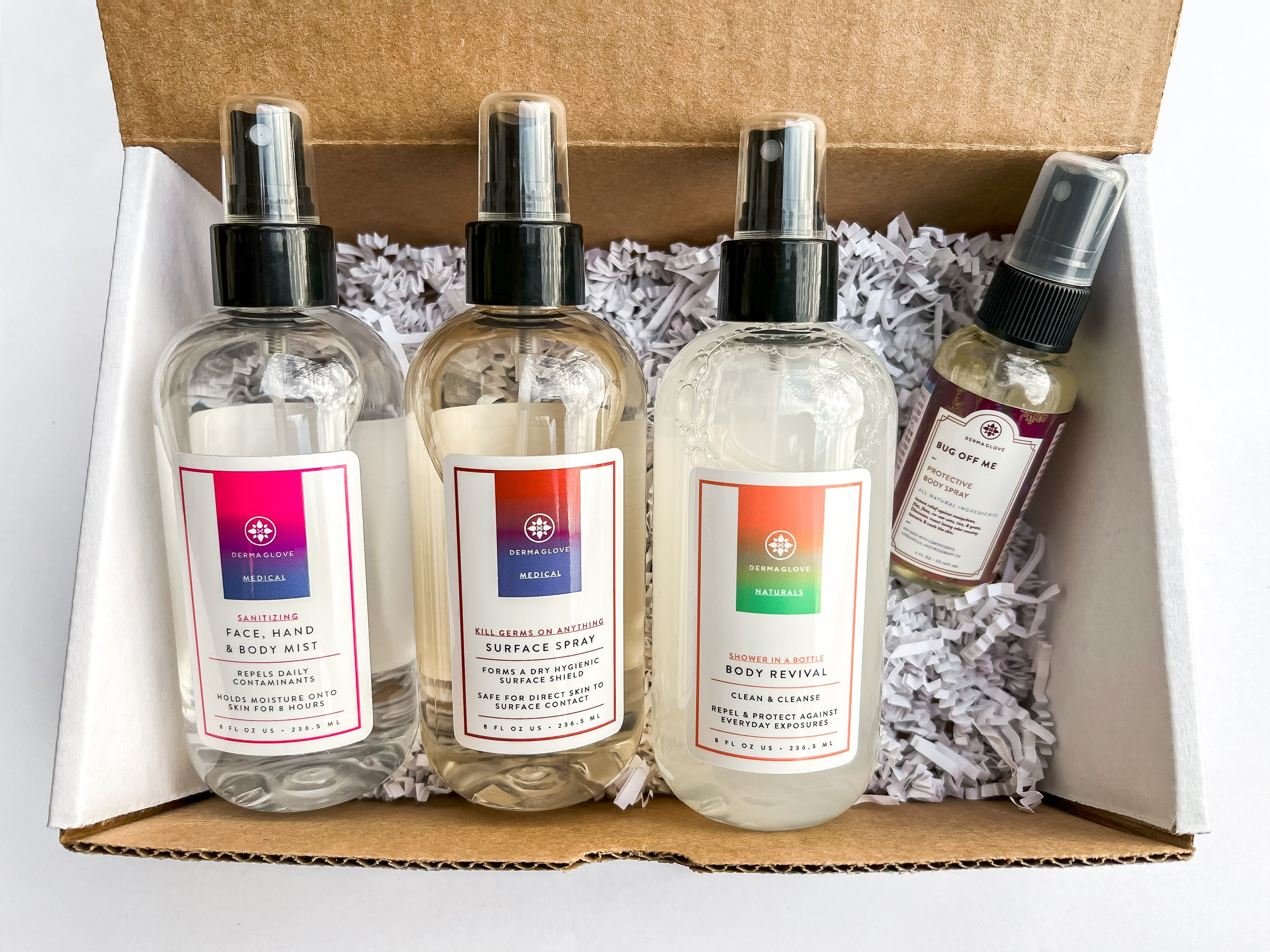 Collection Includes: 8oz FACE, HAND, AND BODY MIST, 8oz BODY REVIVAL, 8oz SURFACE SPRAY, and a travel size of BUG OFF ME